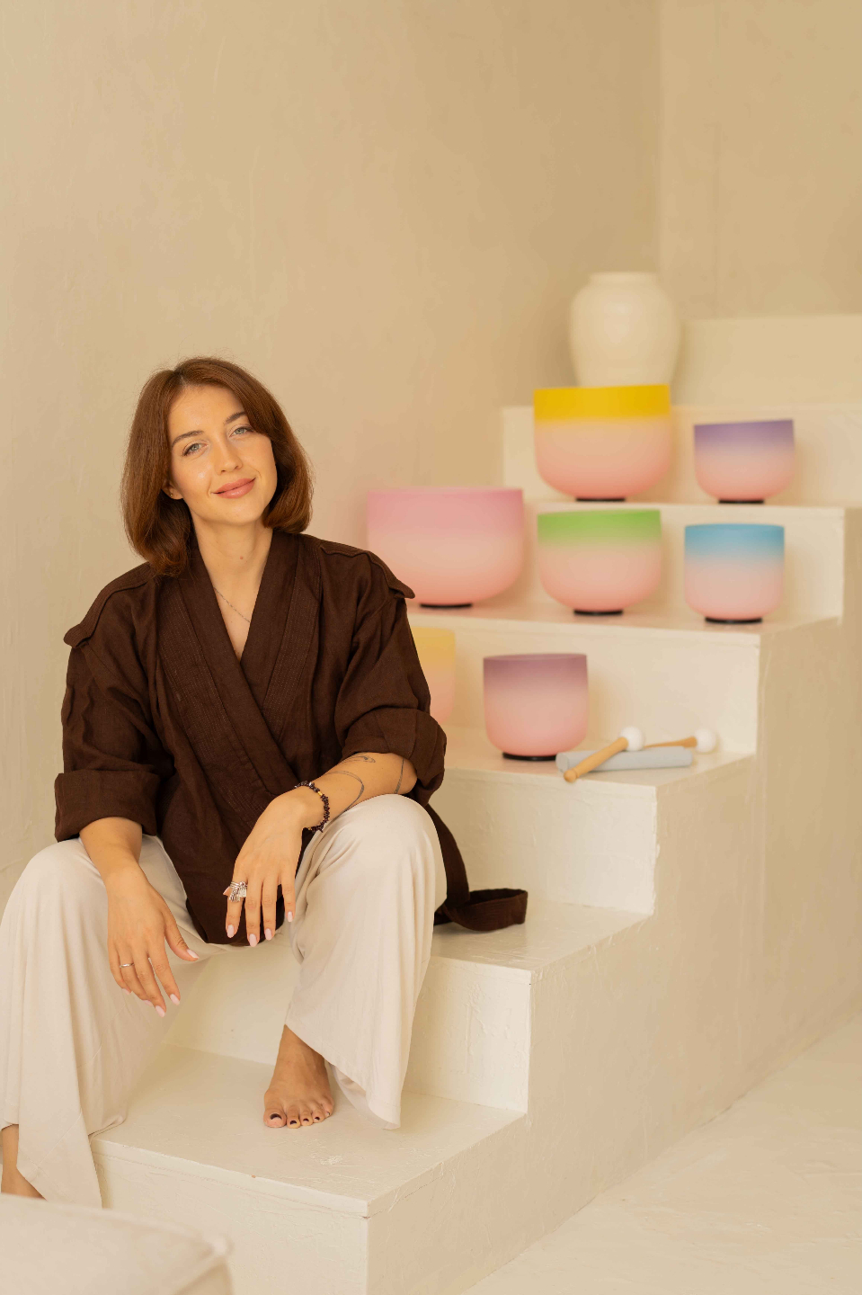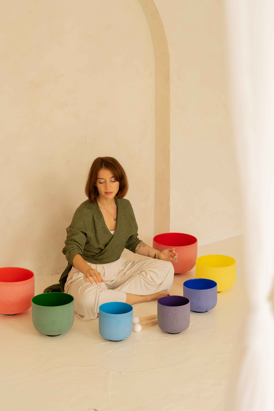 Olga received her training across Europe, Asia, and Australia, studying various sound healing traditions along with energy healing modalities, hypnotherapy, psychology-informed approaches, and somatic practices. This diverse background allows her to bridge both scientific and energetic perspectives in her work.